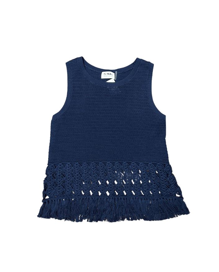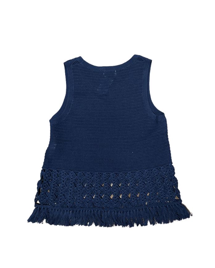 • Knit tank top featuring crochet-like details, finished with a tasseled hem