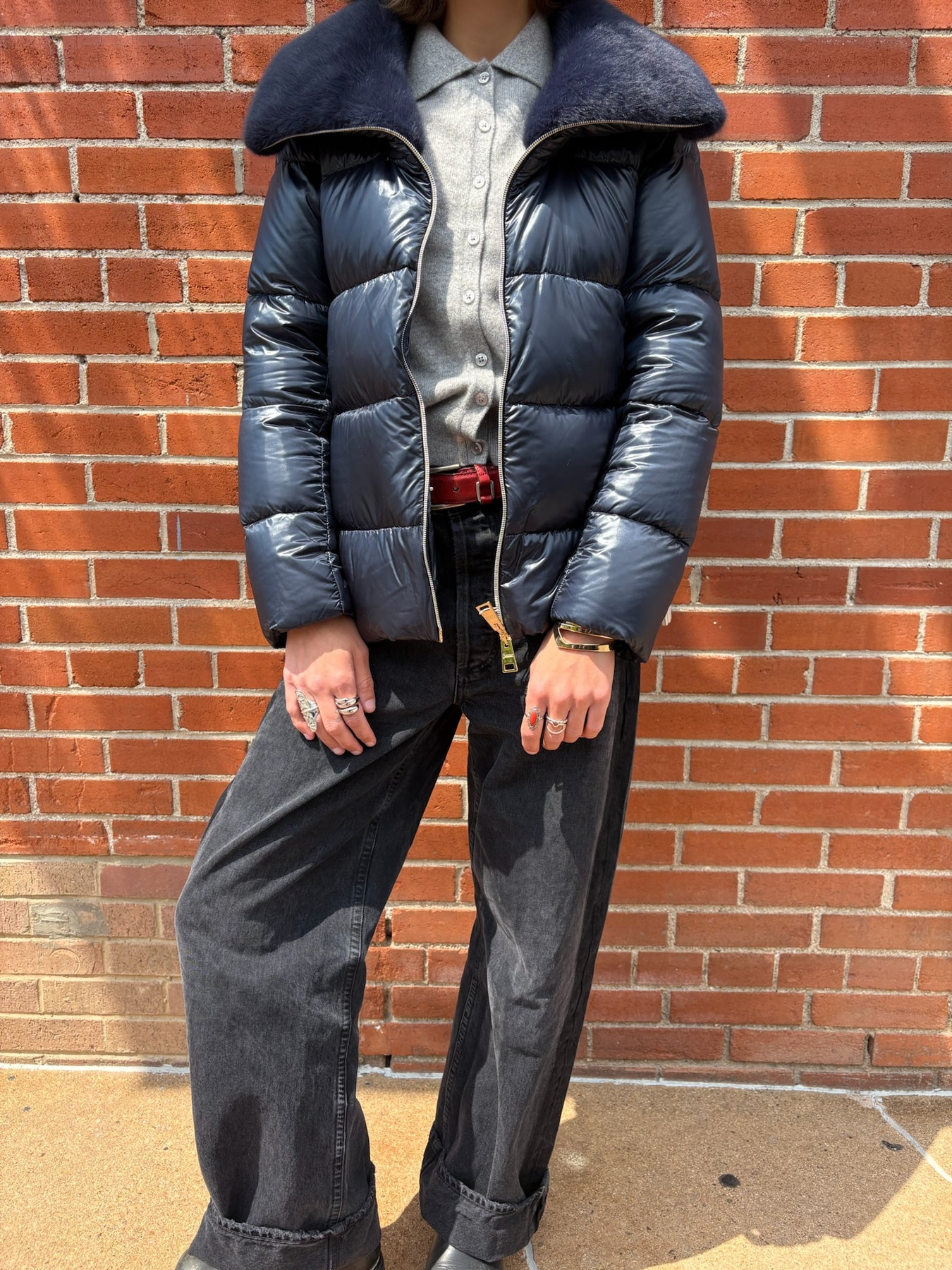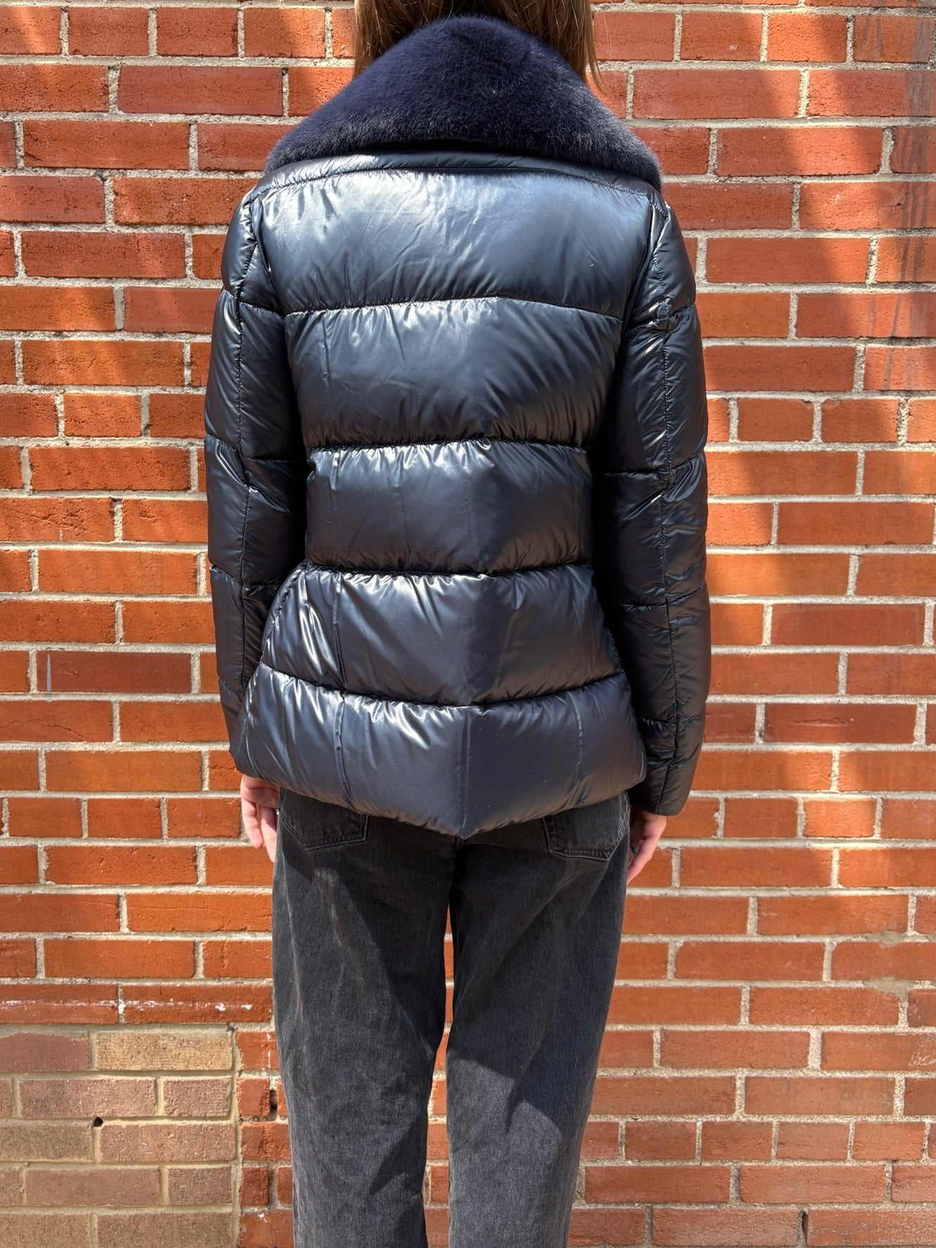 Herno Shiny Nylon Short Zip Jacket w/ Fur Collar in Blu Navy