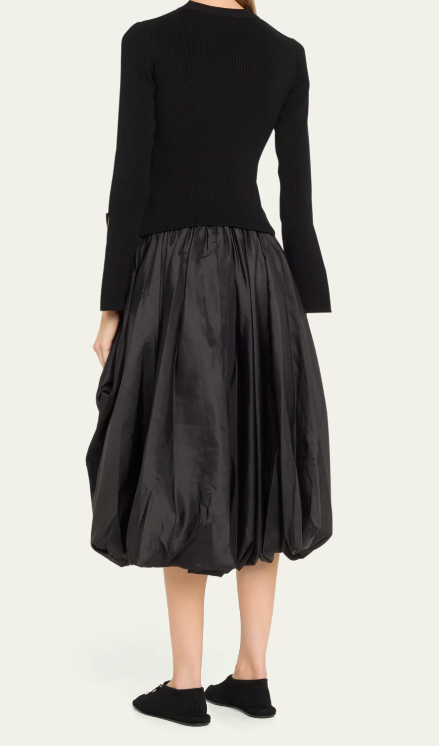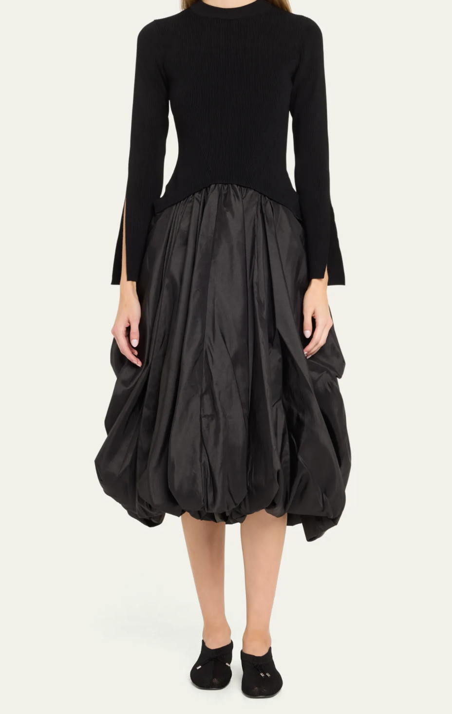• Midi dress featuring a rib-knit with a bodice finished with a bubble skirt
