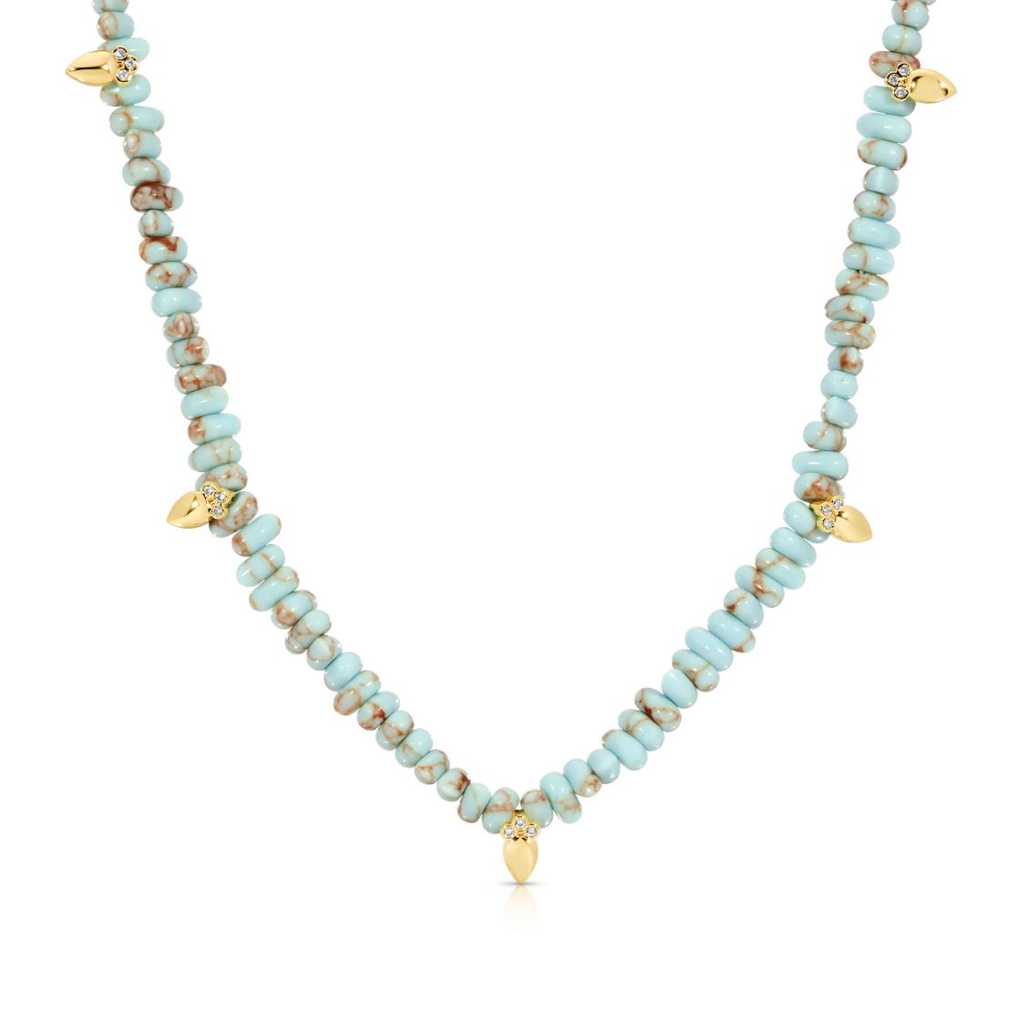 • Lustrous turquoise beads meet gold accents and crystal touches — the Athena Necklace is a refined symbol of earthy elegance and modern radiance