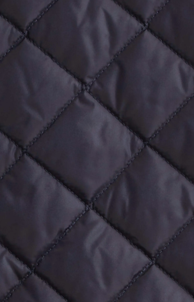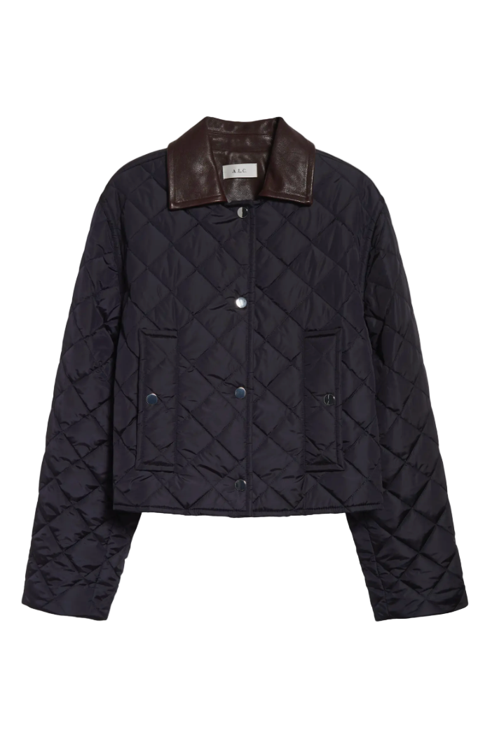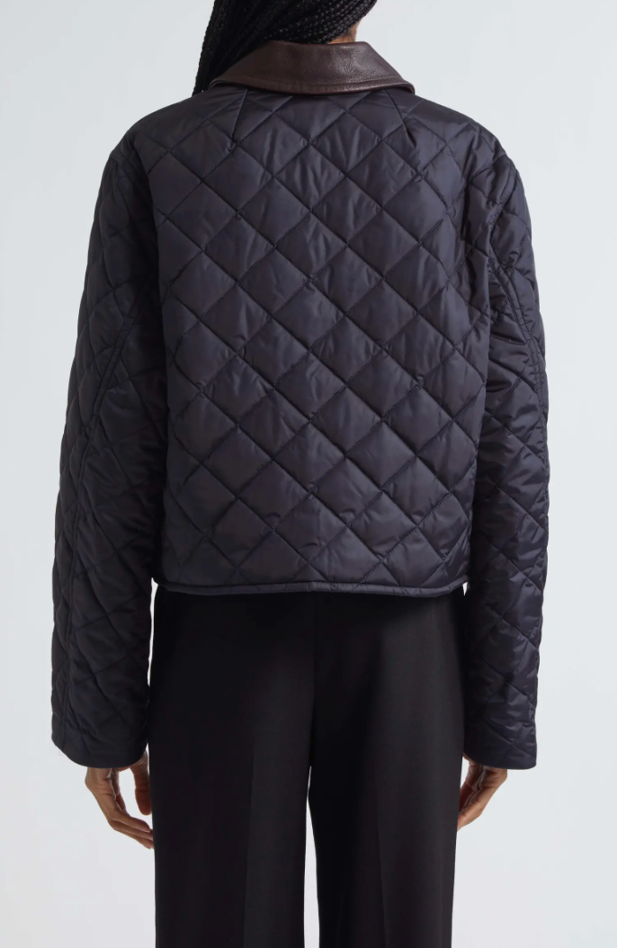 • Classic diamond stitching adds texture to the sleek nylon of a leather-trimmed jacket that's an elevated outerwear option