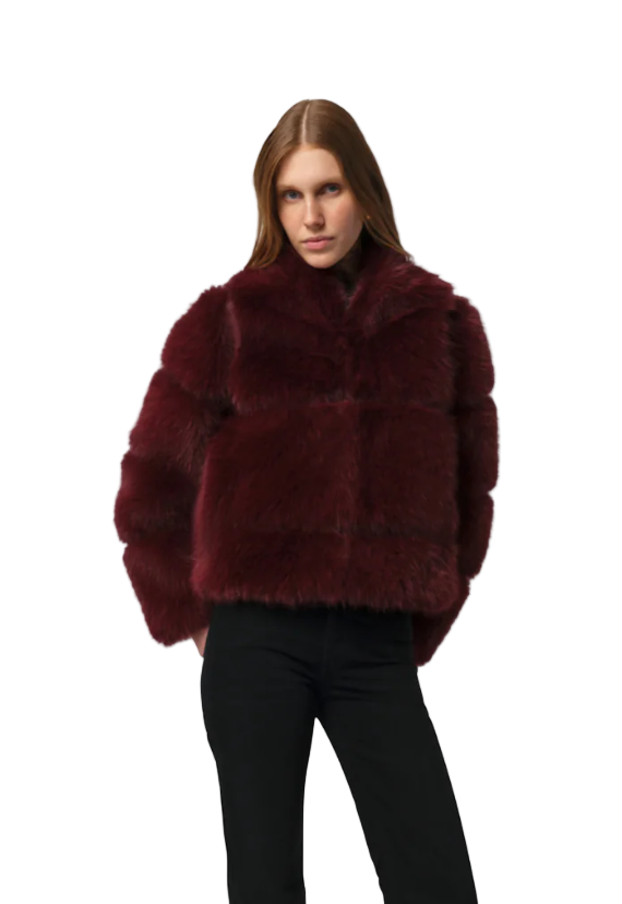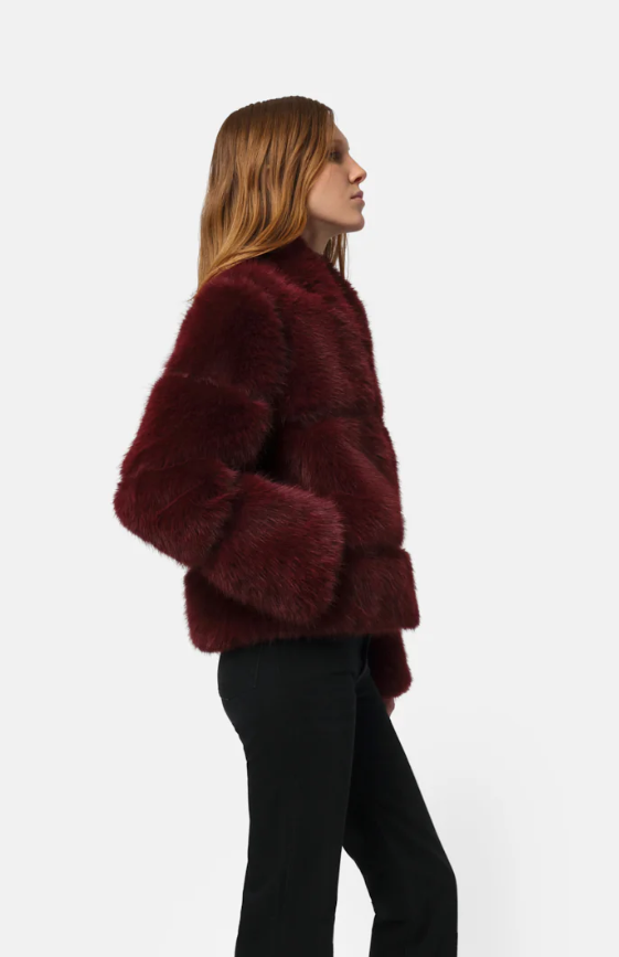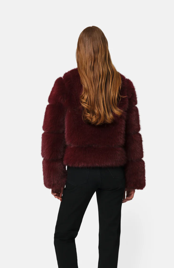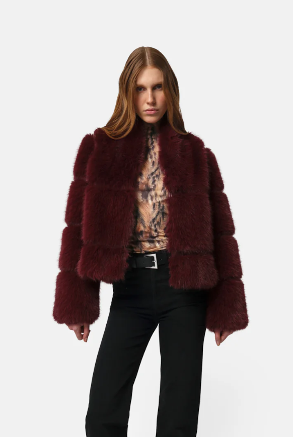 • The Sai is a tiered faux fur coat with a cropped length, long sleeves, and side hand warmer pockets
