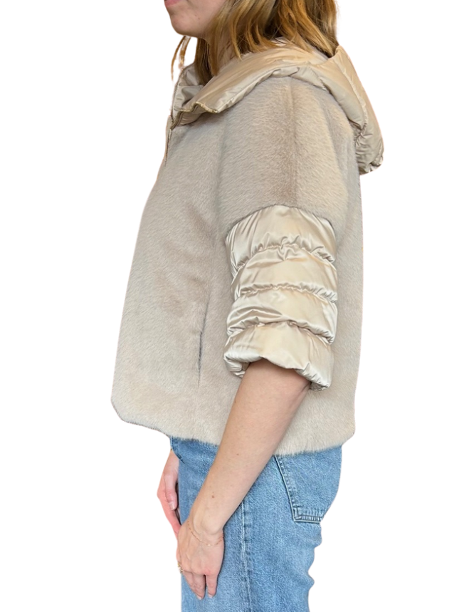 • Gorgeous layered look created by the contrast of champagne colored down and faux fur