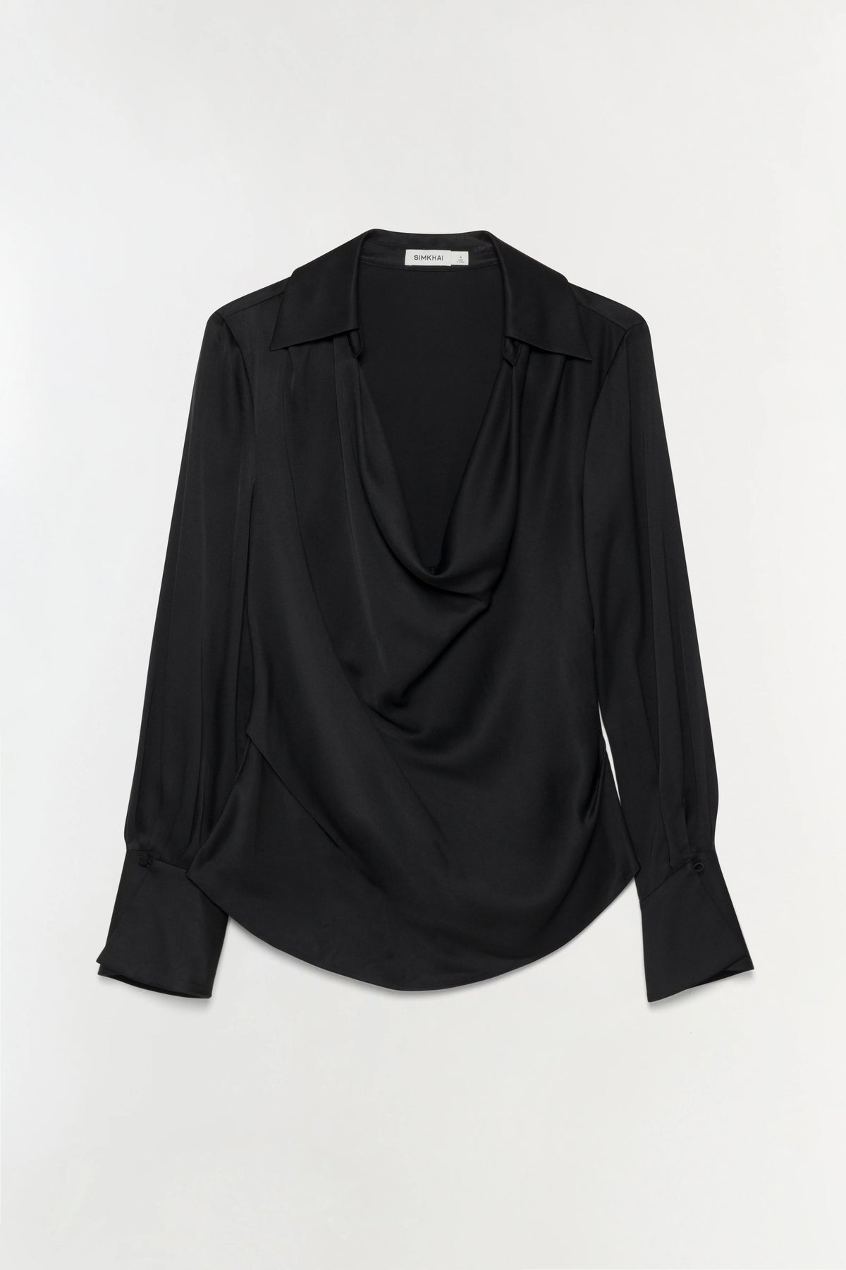• A fluidly draped satin top with a spread collar and cowl neckline that gathers thoughtfully at the sides