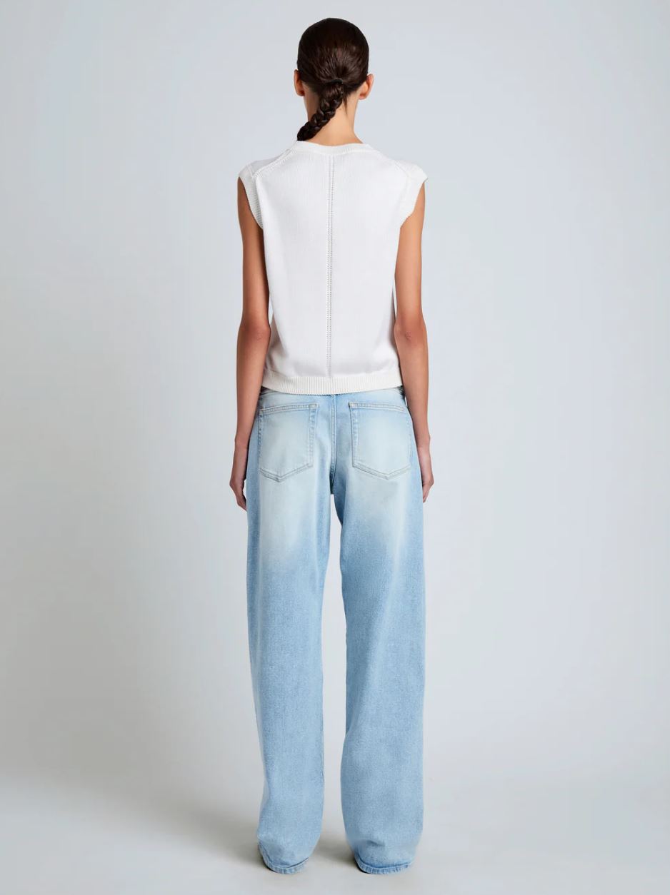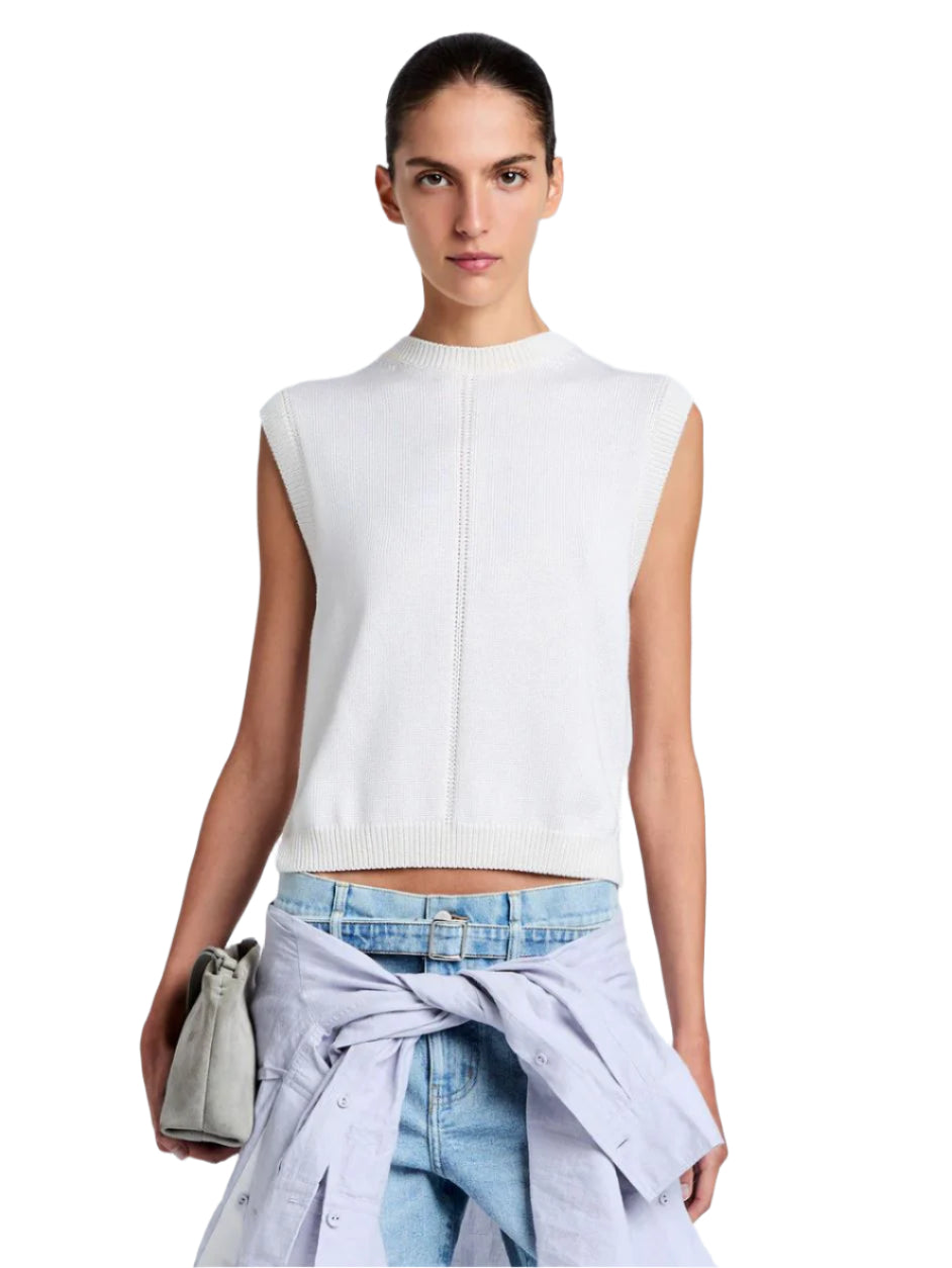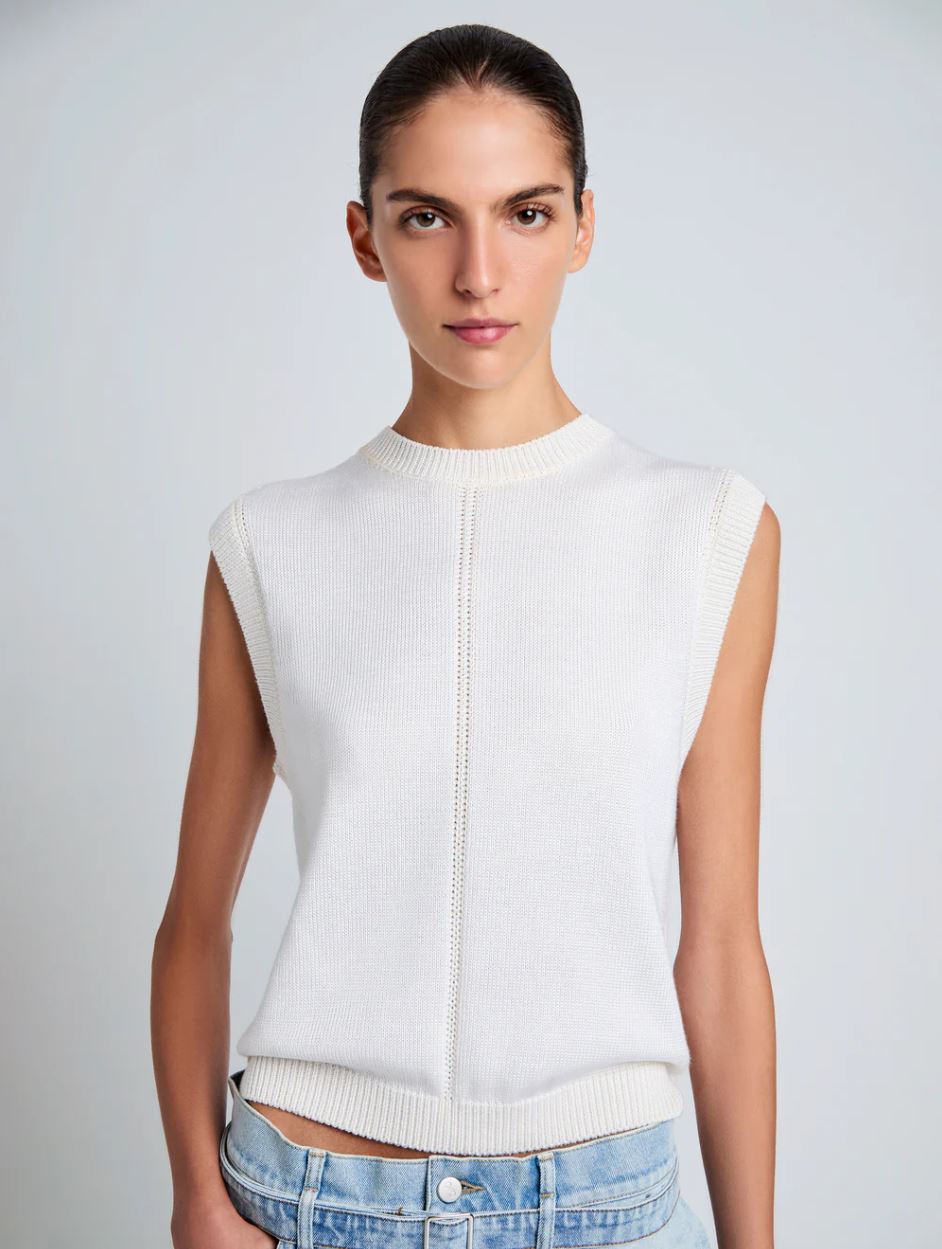 • The Emily Sweater in Plaited Viscose Rib is designed to a relaxed, sleeveless silhouette with ribbed hems and center stitch detailing