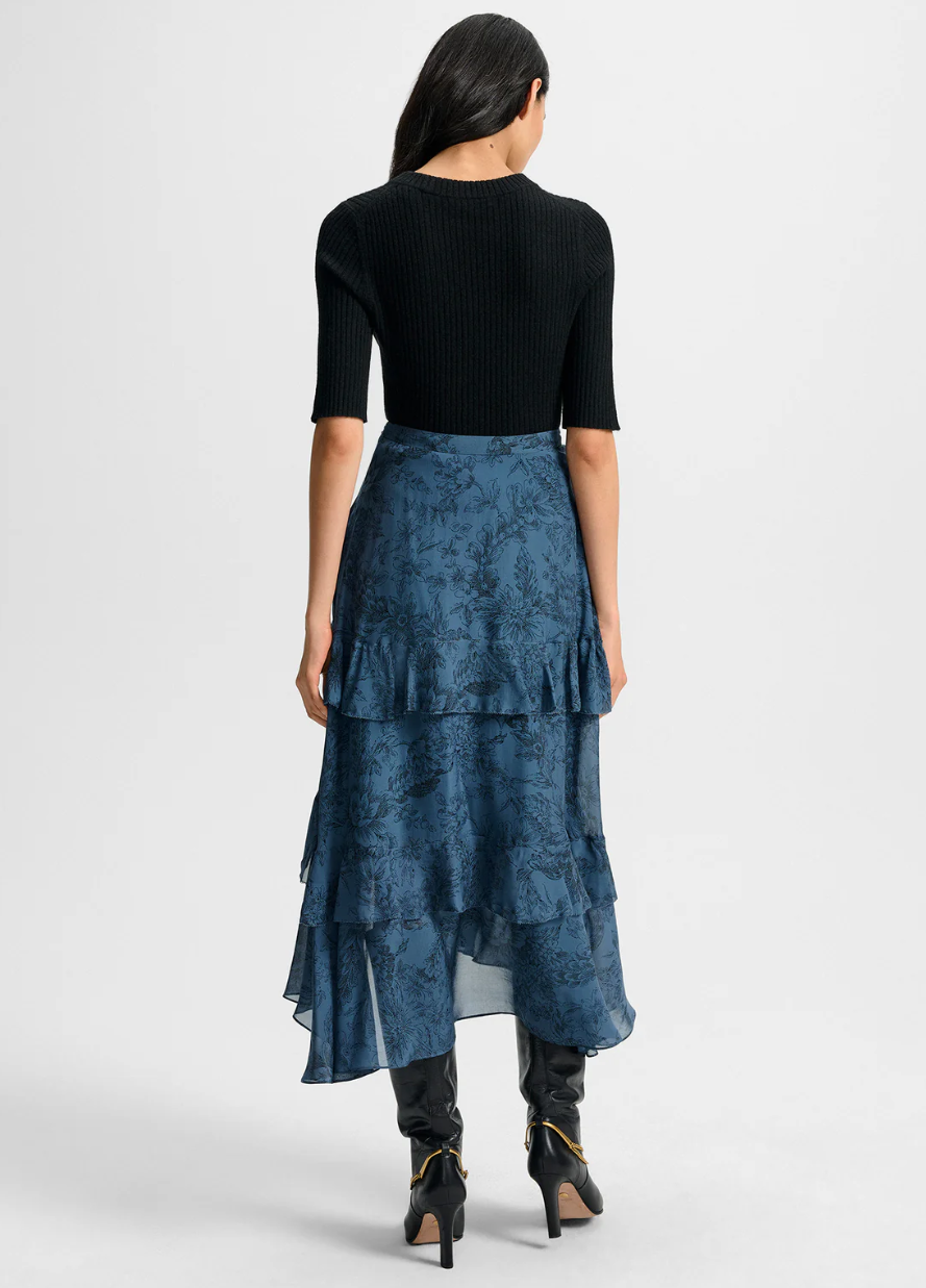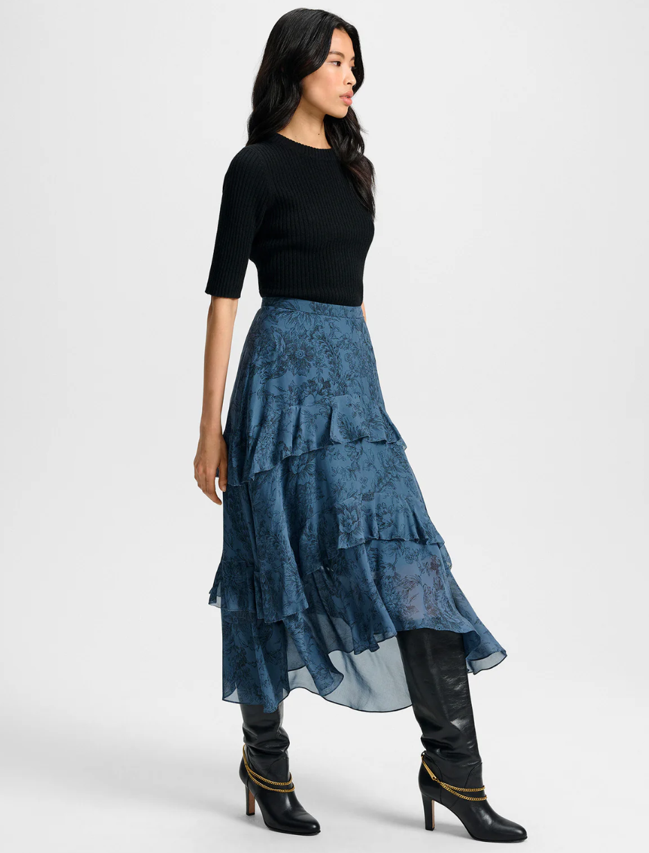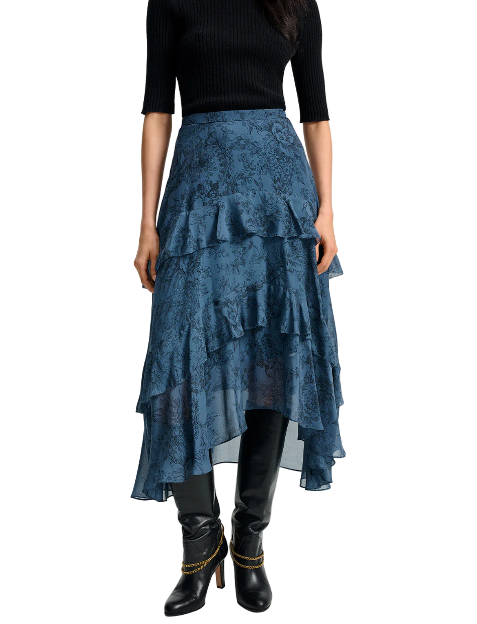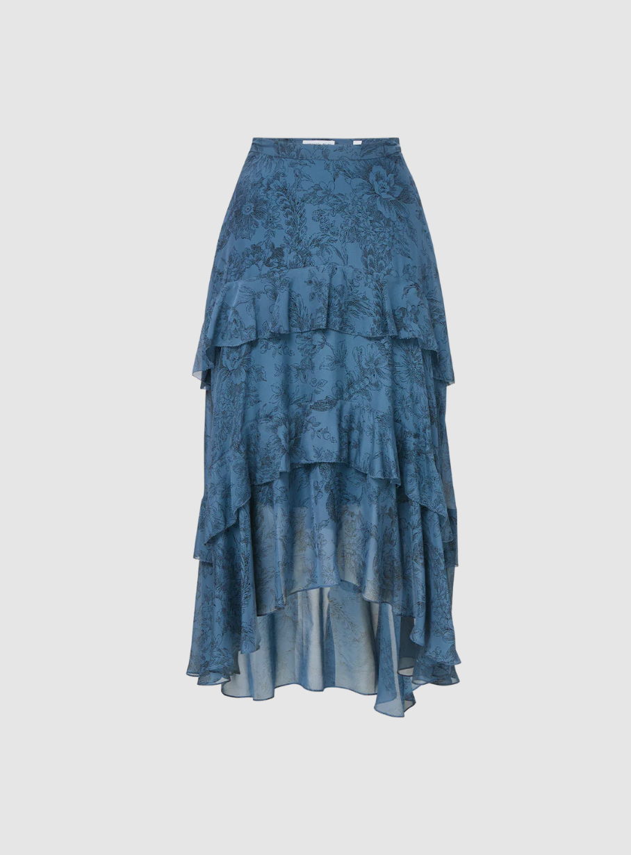 • Crafted from premium silk with a blue toile-inspired floral print, the Graeme high-waisted skirt features a three-tiered midi silhouette, finished with dramatic ruffles, a handkerchief hem, and a mini-length lining for ease